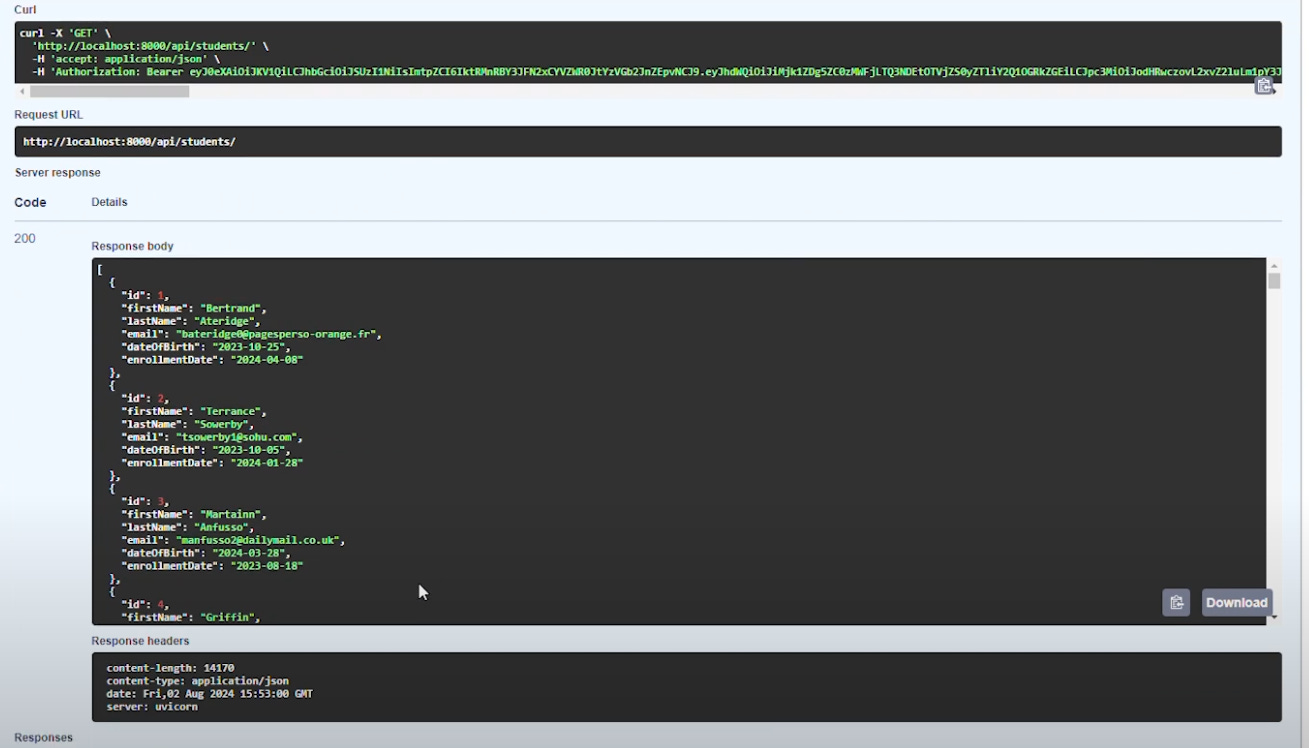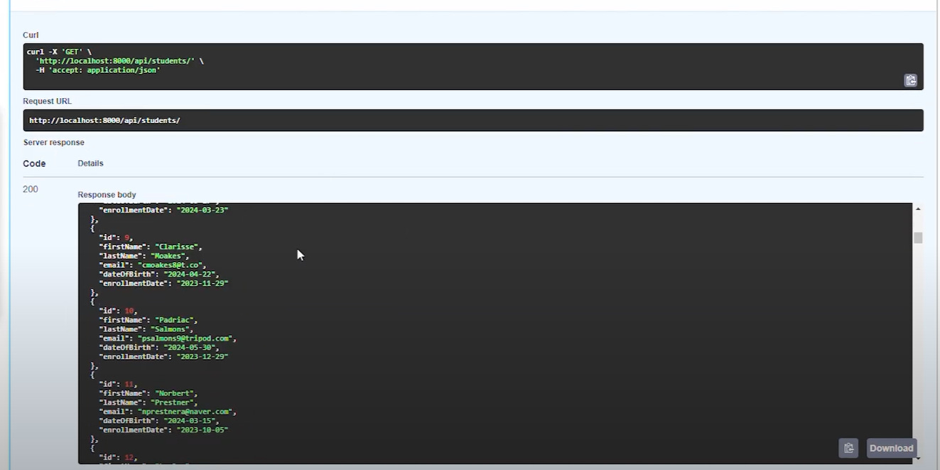 And testing the endpoint returns the students data: