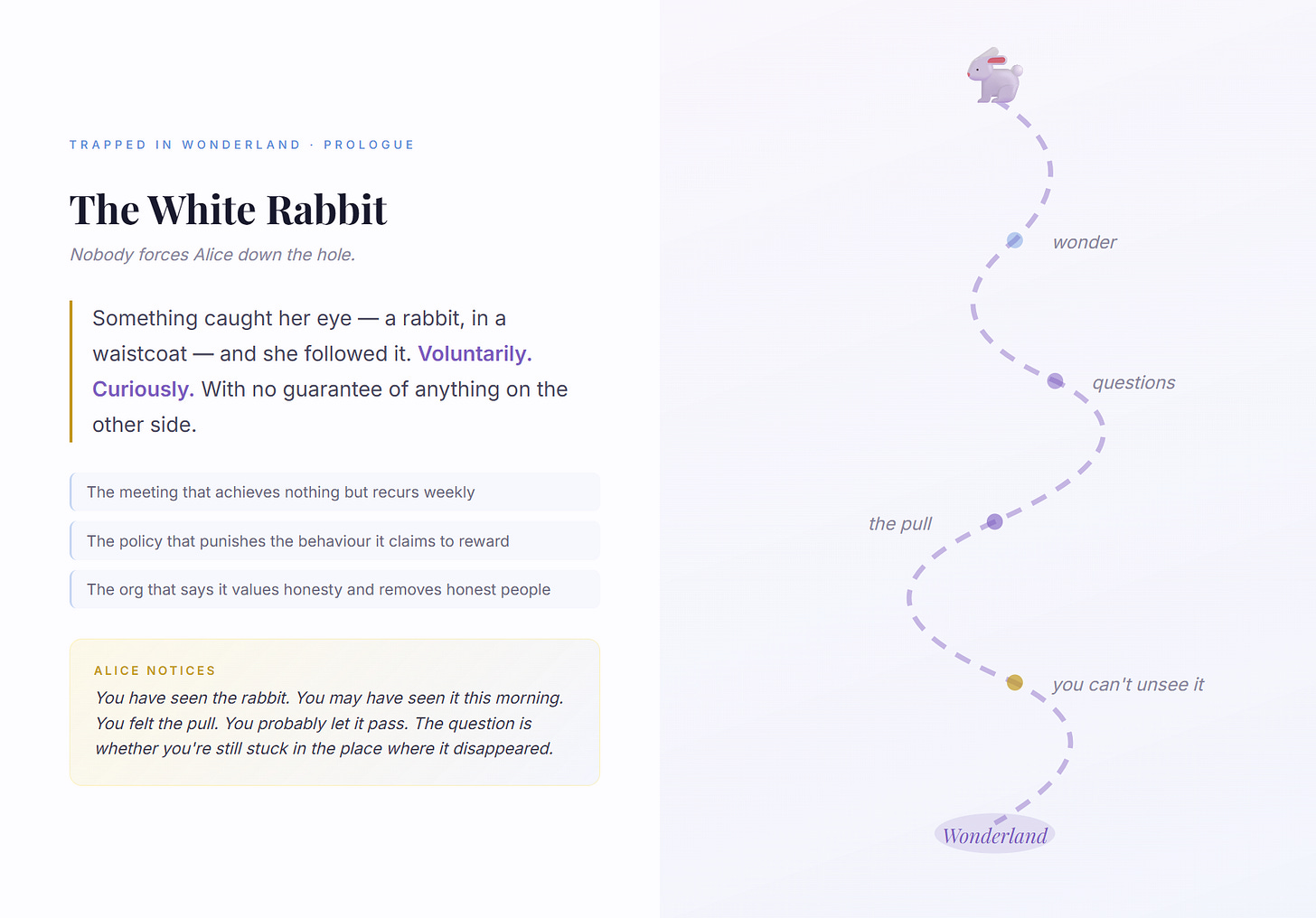 Alice notices: You have seen the rabbit. You may have seen it this morning — in a meeting, in a headline, in the gap between what someone said and what they meant. You felt the pull. You probably let it pass. This is not a failure. It is what Wonderland has trained you to do. The question is whether you are still stuck in the place where it disappeared.