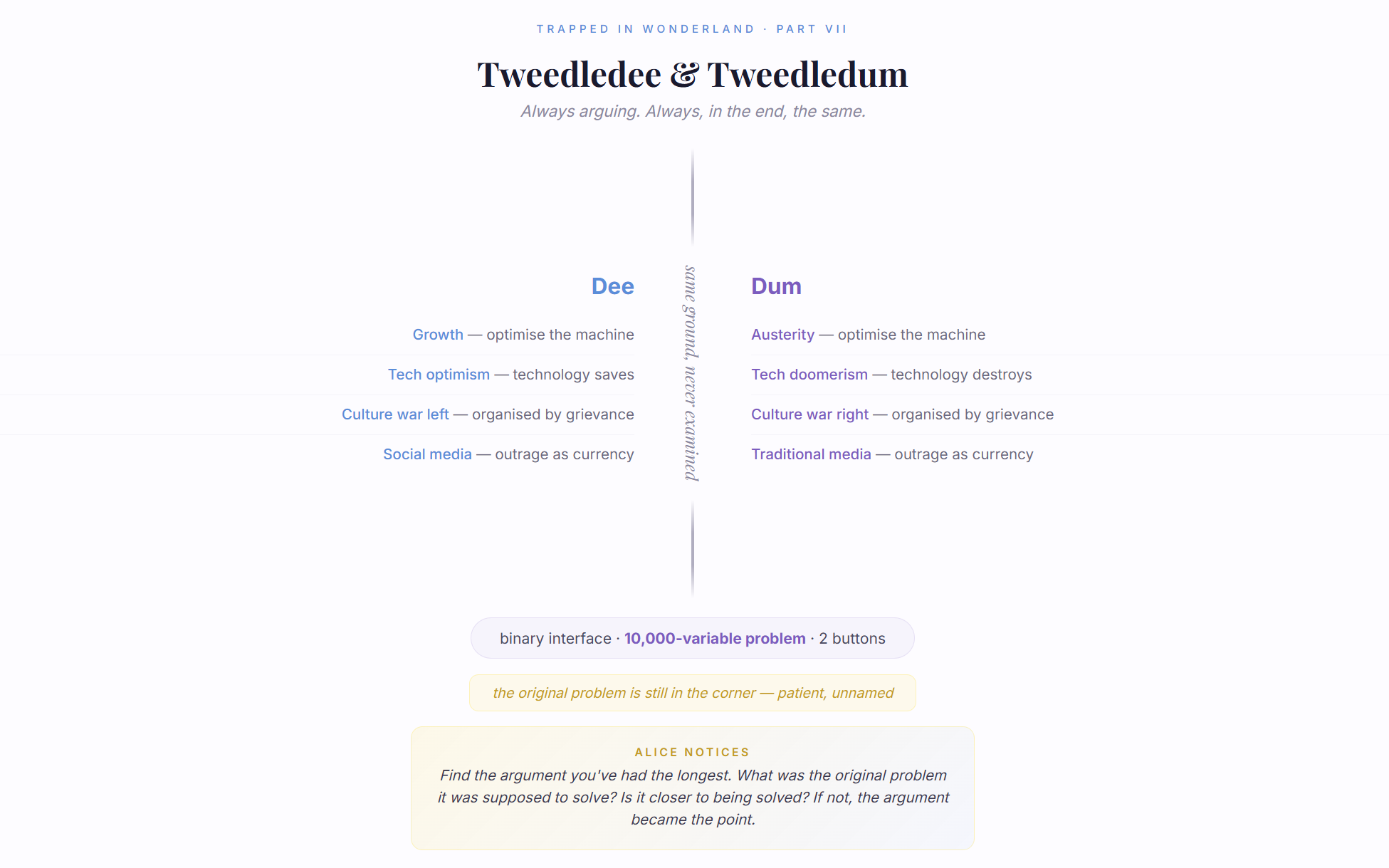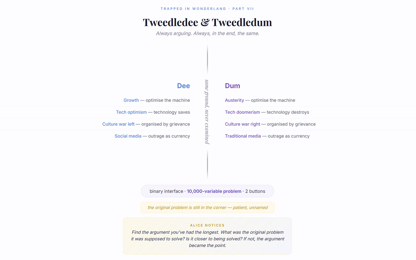But here is what Carroll could not quite have anticipated, and what we have since perfected: the argument itself becomes the distraction. The fighting is so consuming, so identity-defining, so genuinely felt — that no one notices that while they have been arguing, the original problem has been quietly left in the corner. Not solved. Not even properly named. Just abandoned in favour of the much more pressing question of who is winning.