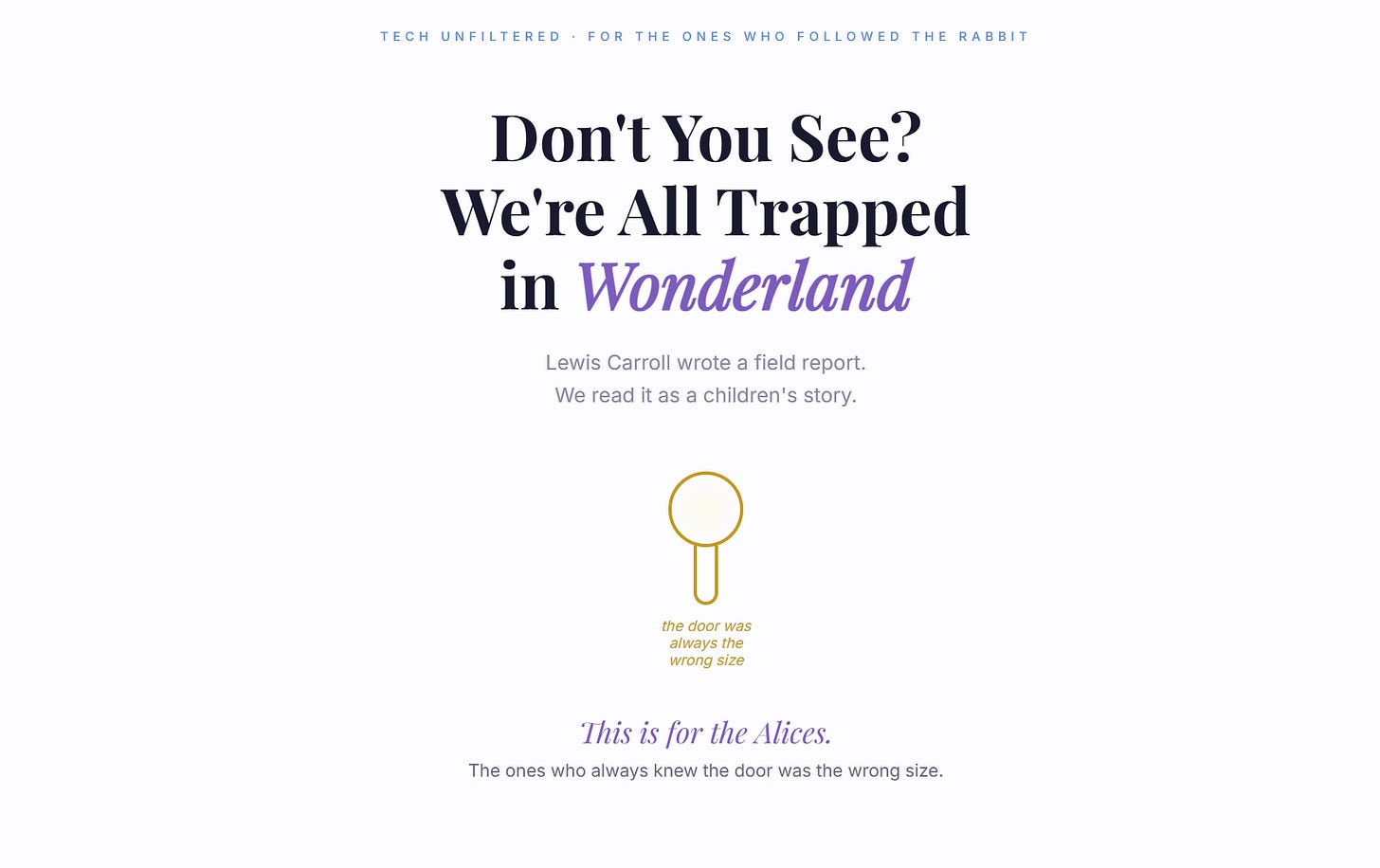 Lewis Carroll wrote a children’s story about a girl falling into a world of nonsense rules, arbitrary authority, and creatures trapped in loops they couldn’t name. We read it as fantasy. I think he was writing a field report about our current reality.