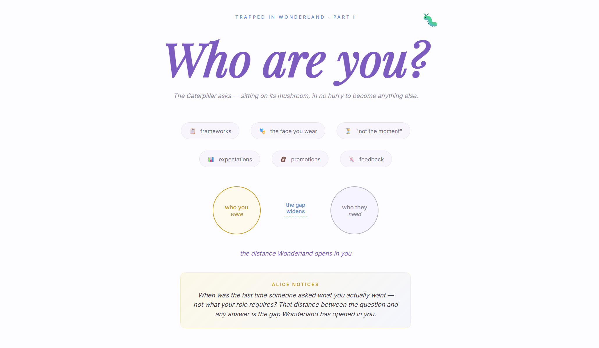Alice notices: Think about the last time someone asked what you actually want. Not what you’re working towards, not what your role requires — what you actually want. Notice how long it takes to find the answer. Notice whether you find it at all. That distance between the question and the answer is the size of the gap Wonderland has opened in you. It is not permanent. But if you ignore it, the gap only widens.