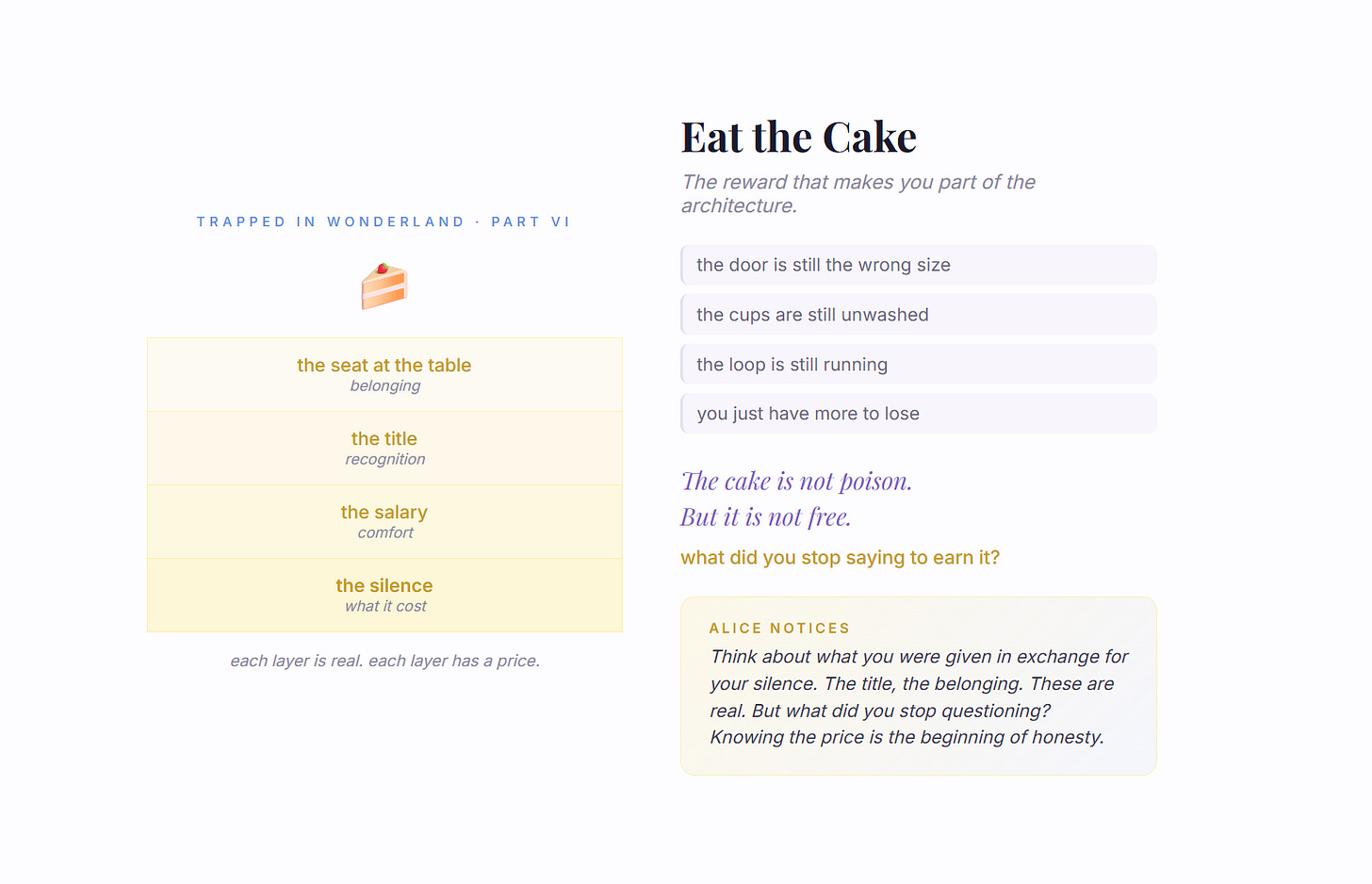 Alice notices: Think about what you have been given in exchange for your silence, your patience, your willingness to work within the frame. The title, the salary, the recognition, the belonging. These things are real and you worked for them and you are allowed to value them. But ask yourself honestly: what did you stop saying, stop questioning, stop pushing on, in the process of earning them? What did you leave at the door to get through it? The cake is not poison. But it is not free either. Knowing the price is not the same as refusing to pay it. It is just the beginning of being honest about the transaction.