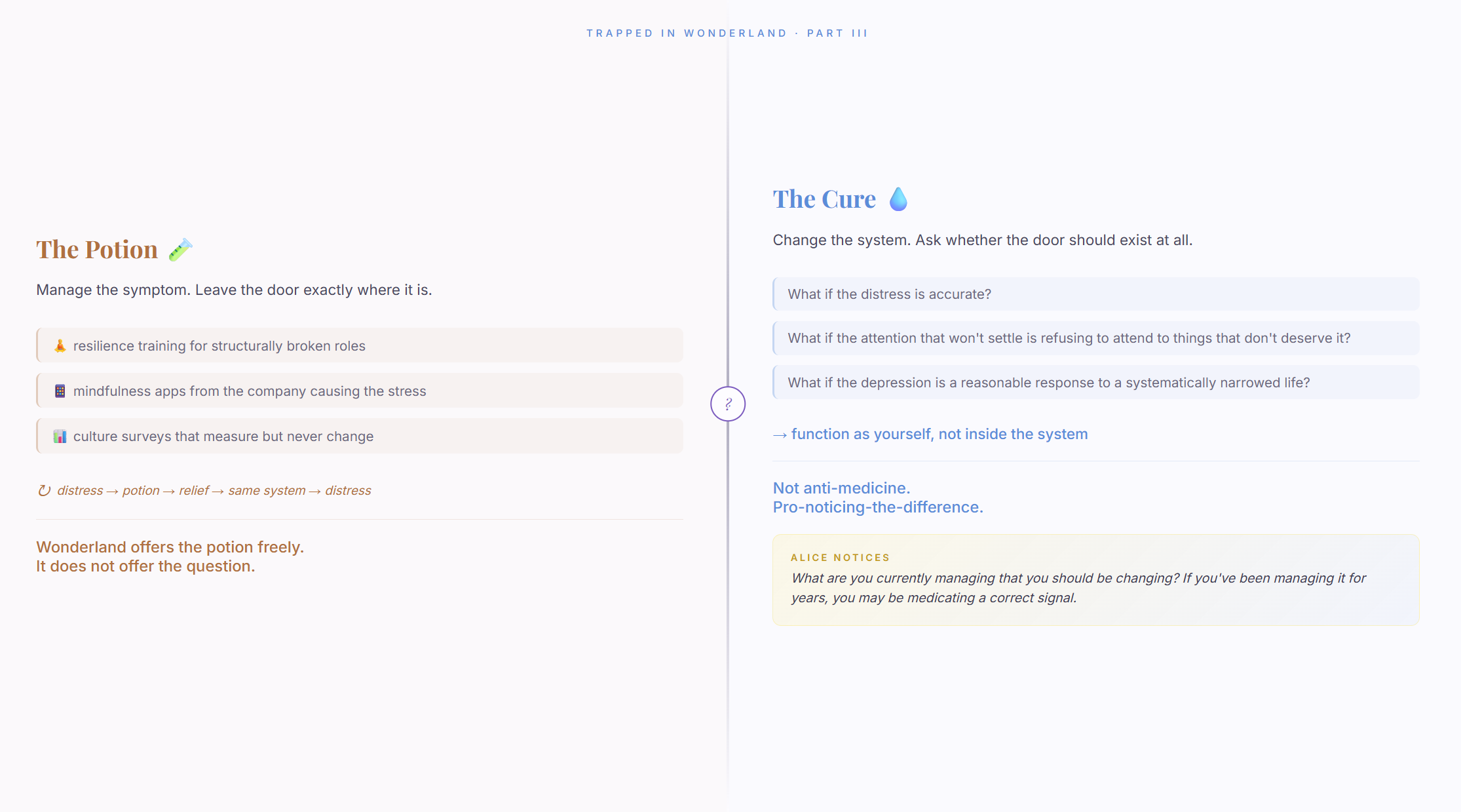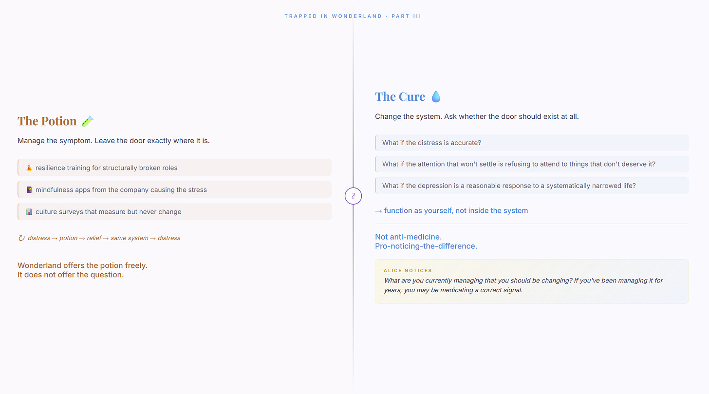 Alice notices: Ask yourself what you are currently managing that you should probably be changing. The distinction matters. Managing is the potion — it makes the situation liveable without making it different. There is a place for management. But if you have been managing something for years without asking whether it should exist at all, you may be medicating a correct signal. The discomfort might be the most honest thing.