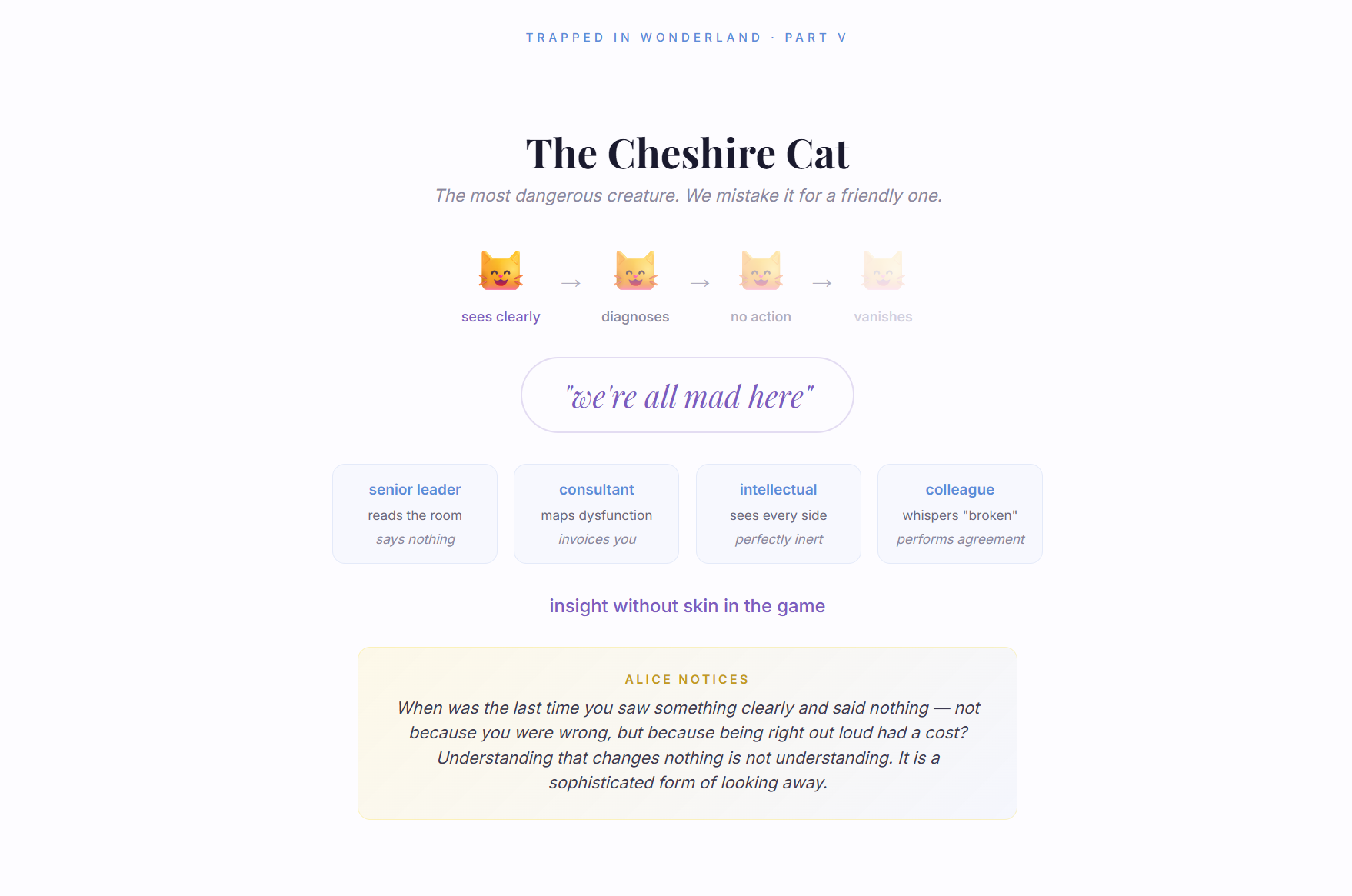 Alice notices: Think about the last time you saw something clearly and said nothing. Not because you were wrong — because you were right, and being right out loud had a cost you weren’t ready to pay. That is the Cat in you. It is not shameful. It is human. But notice how long you have been grinning from a distance at things that needed more than a diagnosis. Understanding that changes nothing is not understanding. It is a very sophisticated form of looking away.
