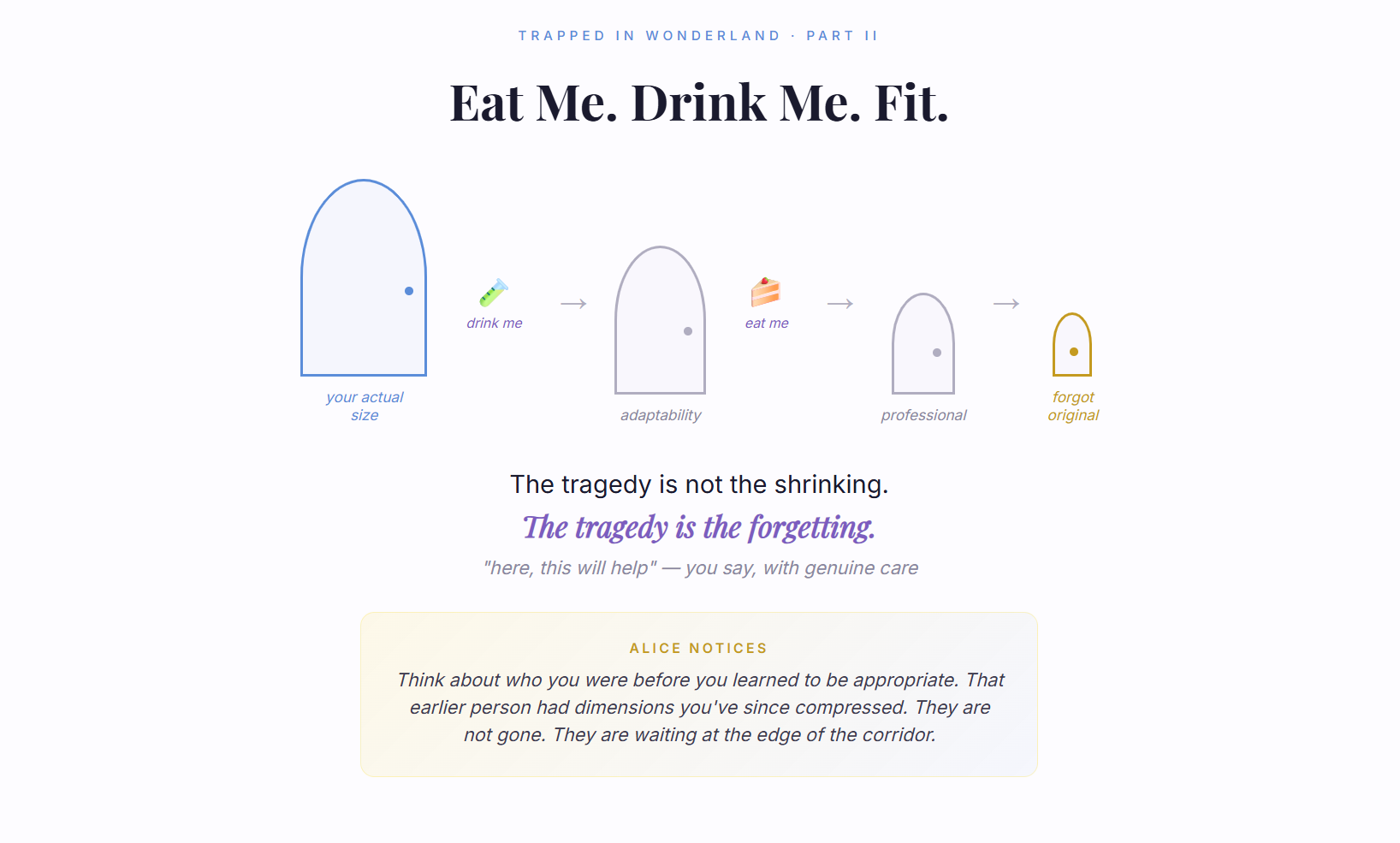 Alice’s first problem in Wonderland isn’t the danger — it’s the doors. They’re always the wrong size. And so the logic of the place immediately begins: you must change. There is never a conversation about widening the door.