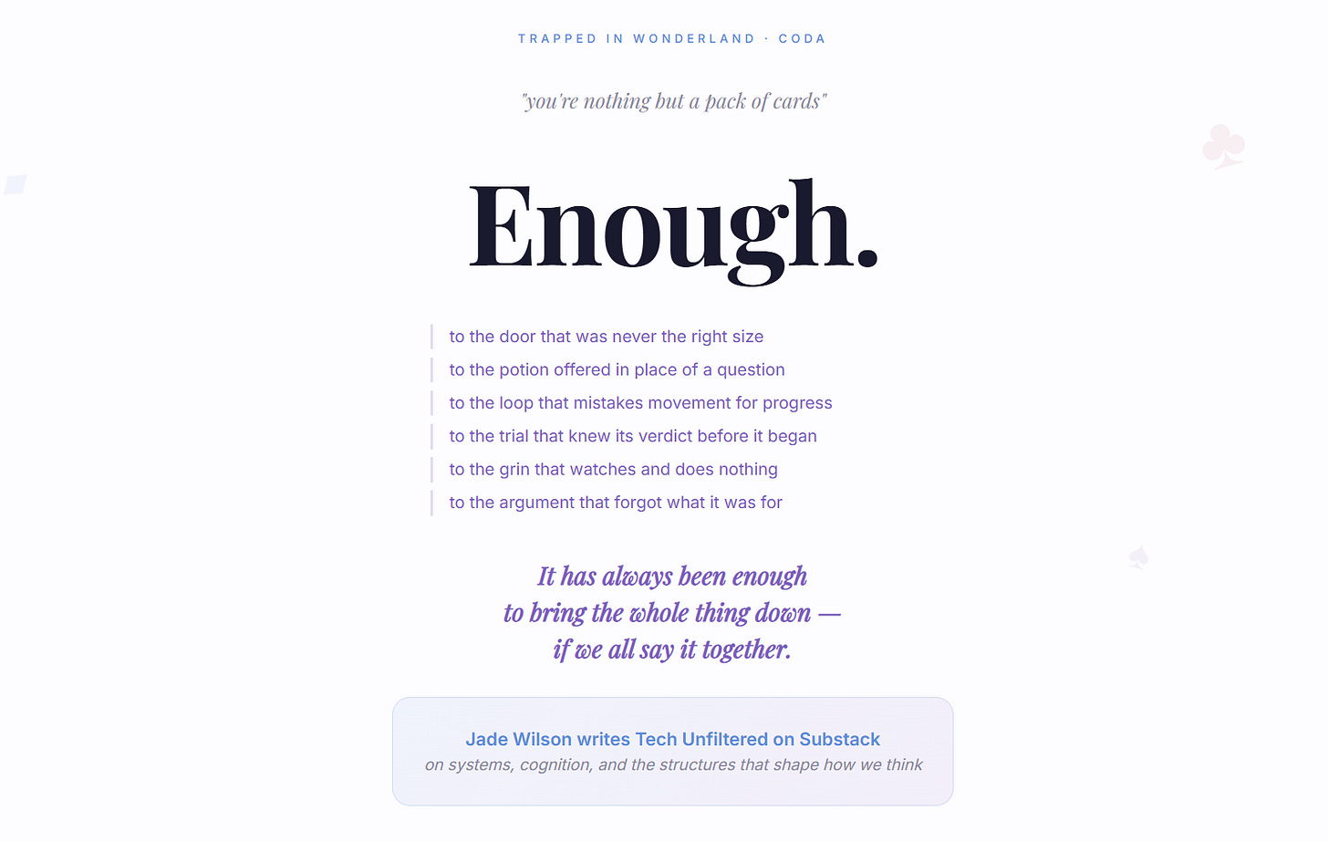 It is a small word. It has always been enough to bring the whole thing down — if we all say it together, and if we remember who the real enemy is. Not the Hatter, exhausted at his table. Not the Dormouse, dreaming of everything it chose not to see. Not even the Queen, enforcing rules she never thought to question. The enemy is the architecture. The loop. The door that was always the wrong size and the system that convinced us the problem was our height. That is what we are saying enough to. That is what falls, when we all start to see it and do something to change it.