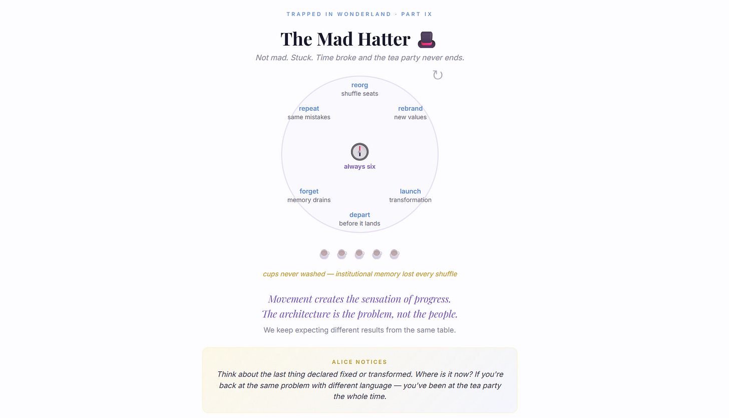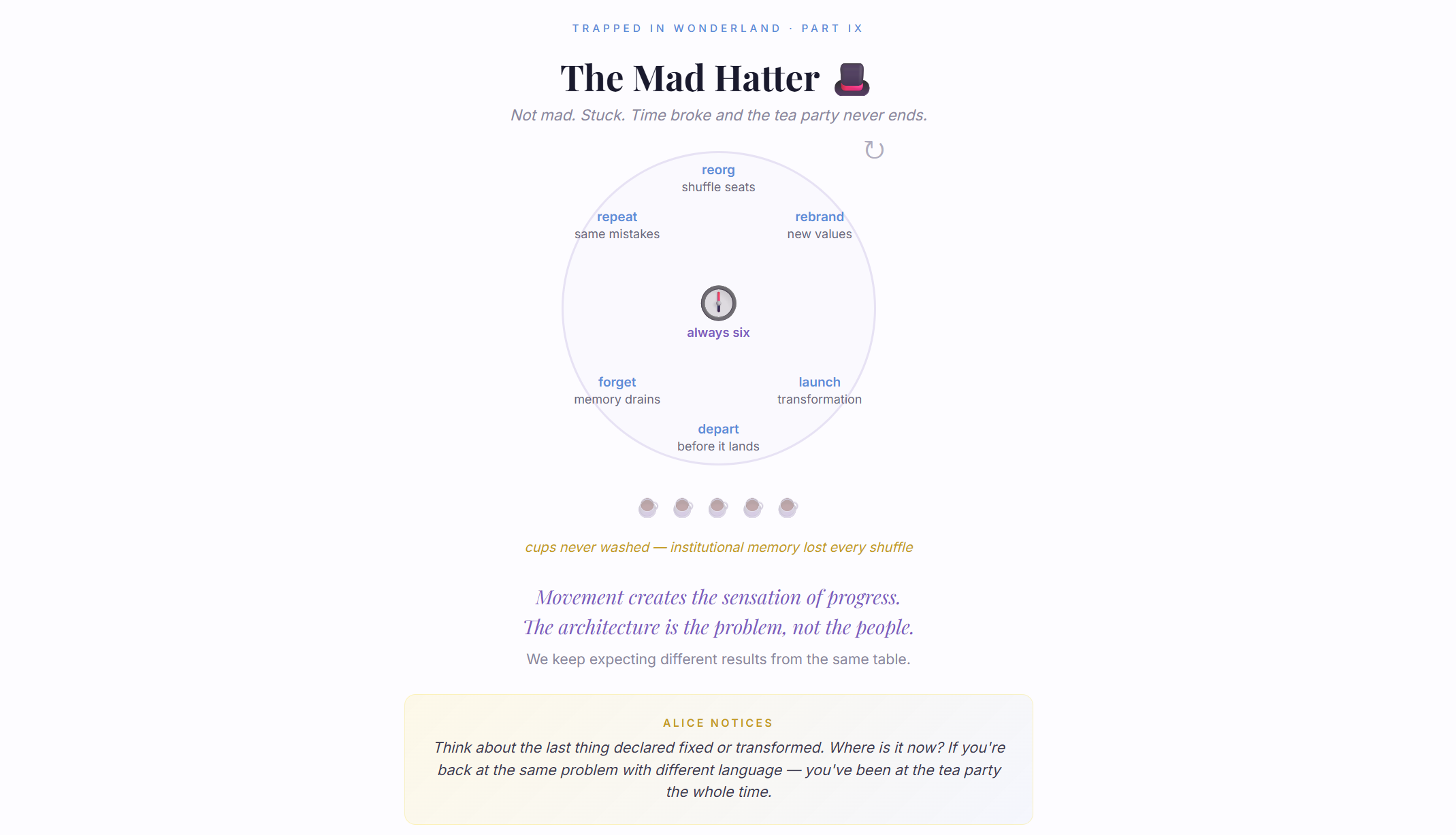 Alice notices: Think about the last time something was declared fixed, transformed, or solved in an organisation or institution you belong to. Then ask where it is now. If you are back at the same problem with different language around it, you have been at the tea party the whole time. The cups are still unwashed. The question is not whether you are tired of moving seats. The question is whether you are ready to stop, look at the clock and start to focus on your own station.