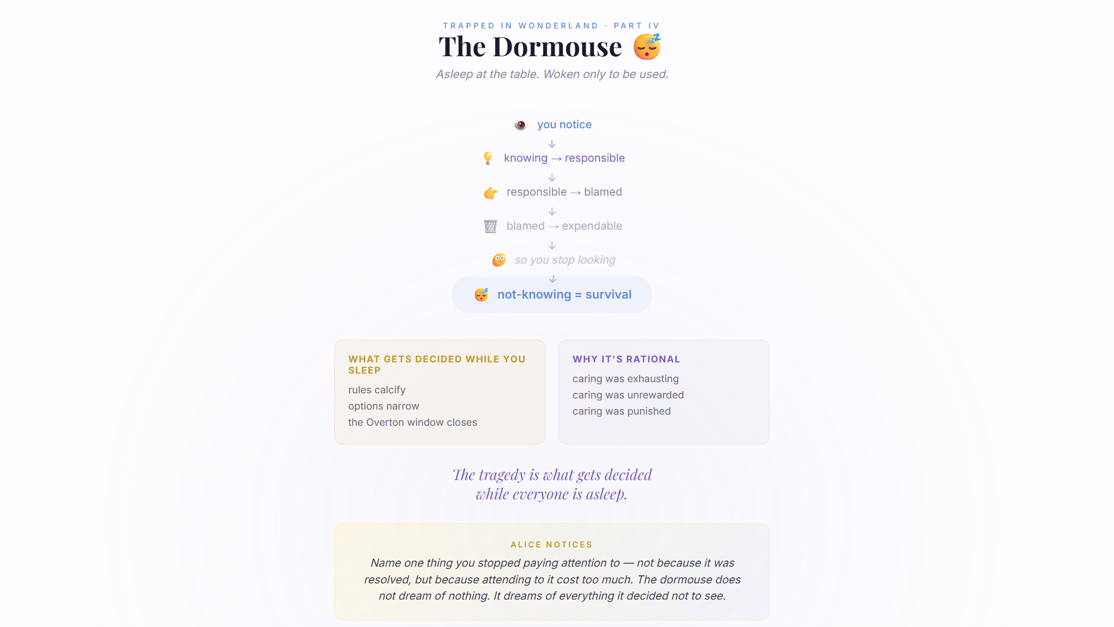 Wilful unawareness is not stupidity. It is often a rational response to an environment that punishes awareness. If knowing means being responsible, and being responsible means being blamed, and being blamed means being expendable — then not-knowing is a survival strategy. The Dormouse did not choose sleep arbitrarily. Something in Wonderland made sleep the safest option. Something taught it that the cost of being present was higher than the cost of missing everything.