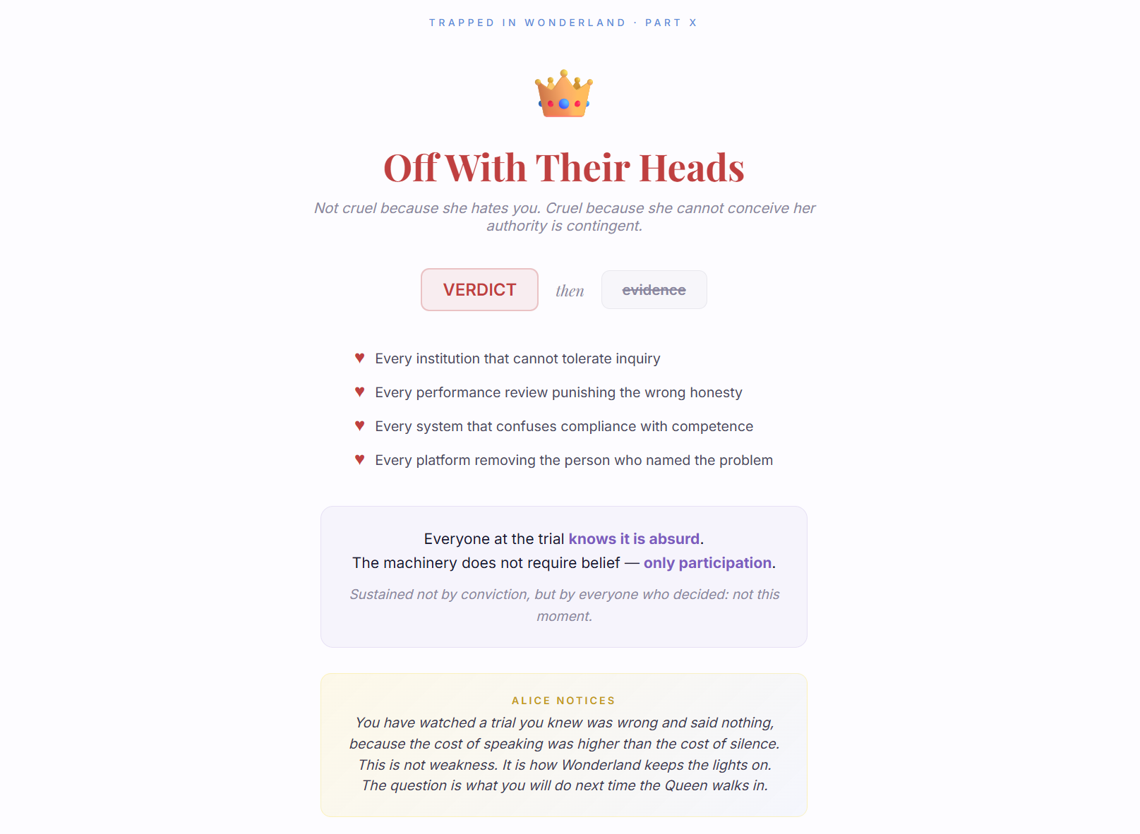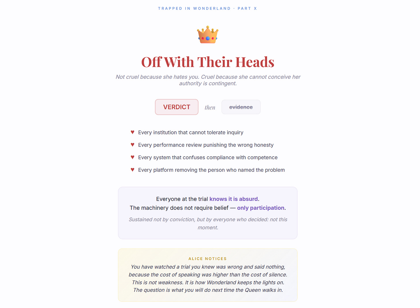 The Queen’s court is not cruel because it hates you. It is cruel because it cannot conceive of a world where its own authority is contingent. It has no epistemology. It has only verdict. It cannot ask am I right? because the question contains, as a possibility, an answer it cannot survive.