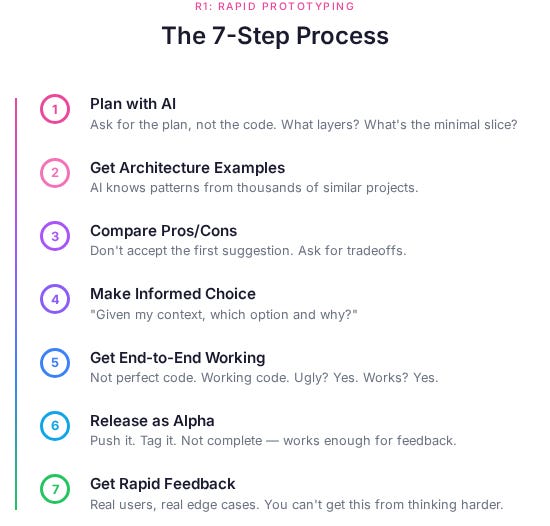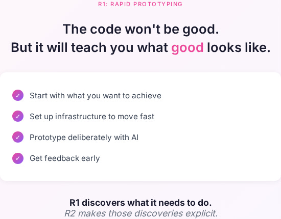 In the next article, I’ll cover R2 (Rigour) - how to take that messy prototype and make it solid. How to identify the patterns that emerged. How to write tests that define contracts, not just check that code runs.