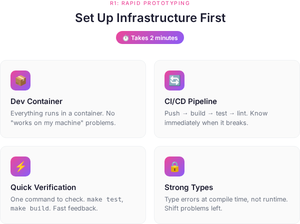 The infrastructure enables this. CI/CD catches breaks immediately. Linting catches style issues before you think about them. Containers eliminate environment problems. Types catch mistakes at compile time.