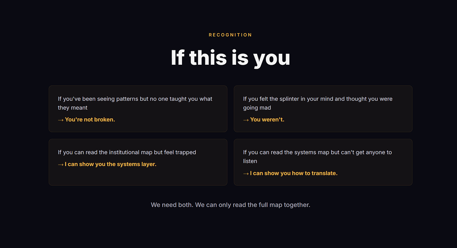 If you can read the institutional map but feel trapped — I can show you the systems layer.
