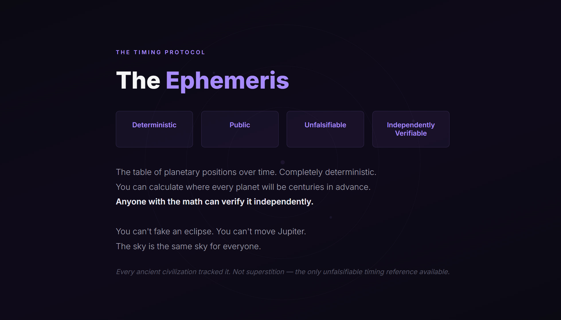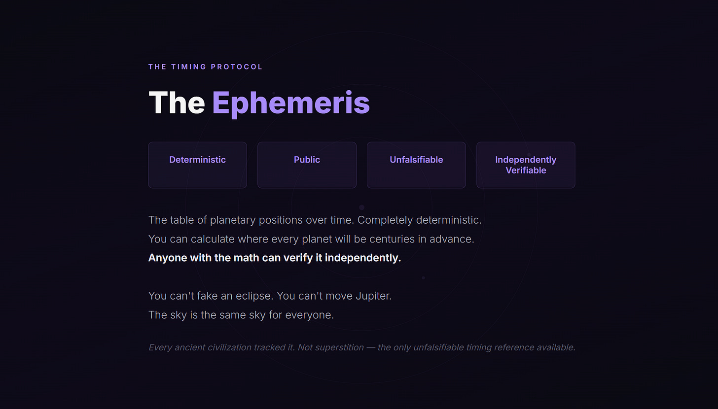 The ephemeris — the table of planetary positions over time — is completely deterministic. You can calculate exactly where every planet will be centuries in advance. Anyone with the math can verify it independently. No one can manipulate it. The planets will be where they will be.