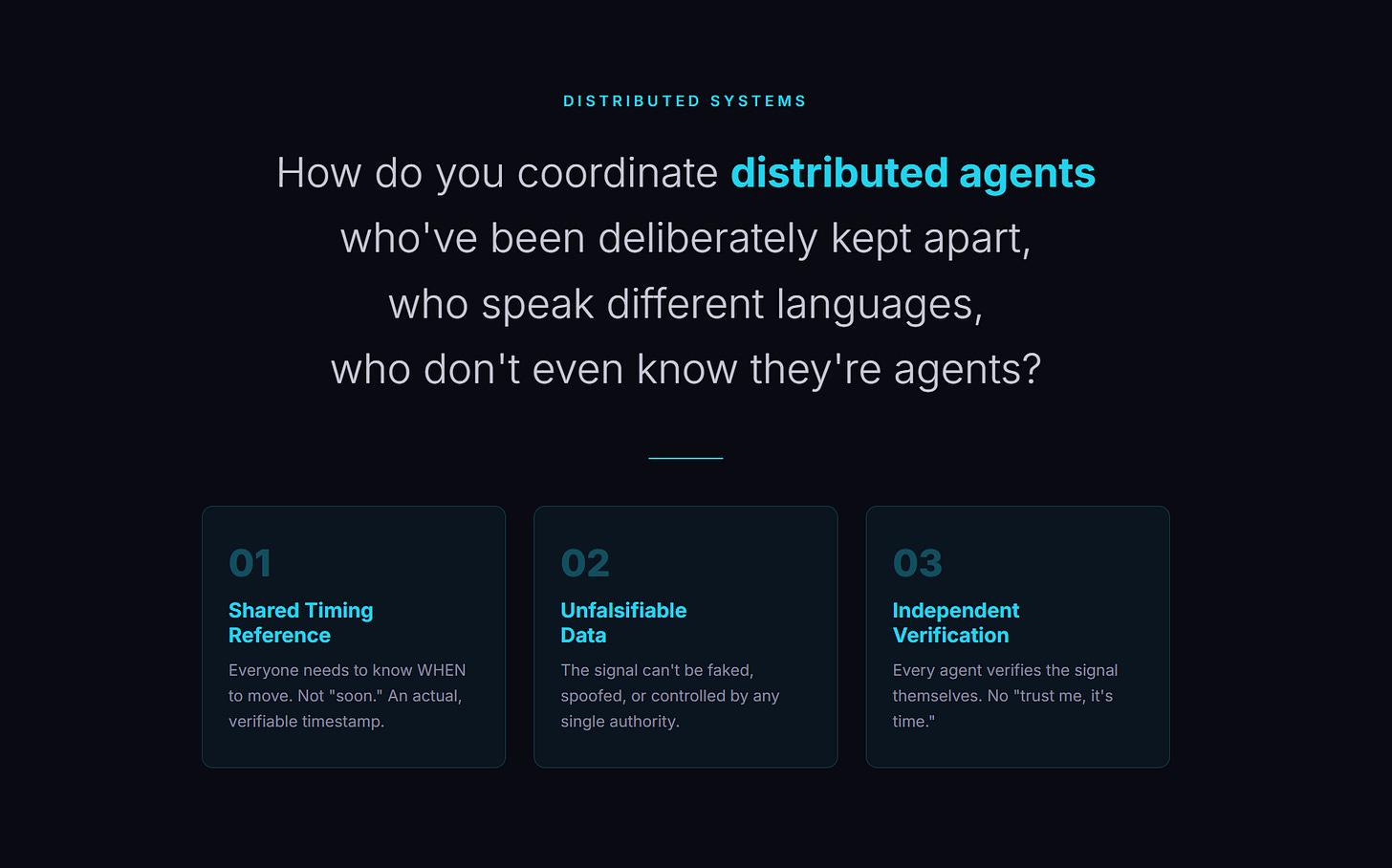If the timing signal can be faked, spoofed, or controlled by the institution you’re coordinating against, it’s useless. The data source has to be outside any single authority’s control. Completely verifiable. Impossible to manipulate.
