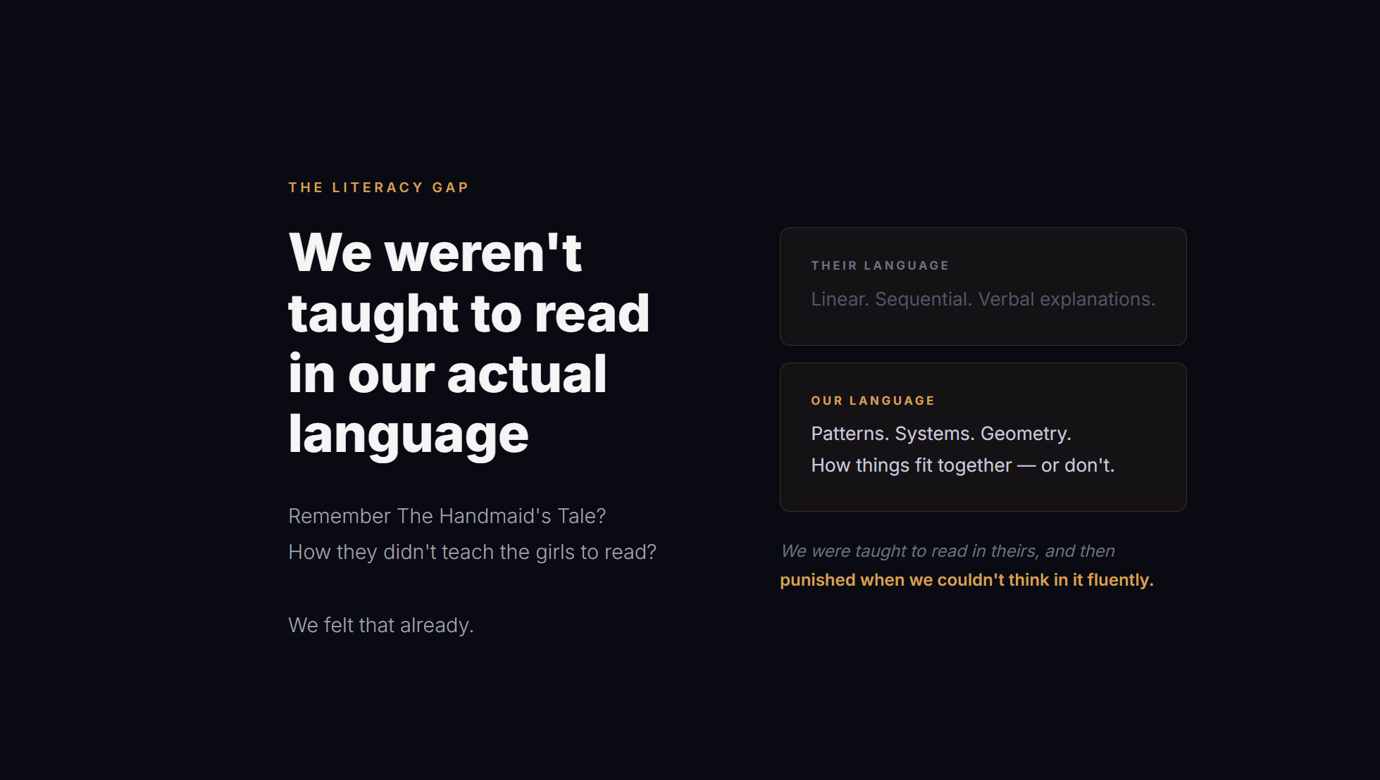 We’re spatial thinkers. Our natural language is patterns. Systems. Geometry. We see how things fit together — or don’t.