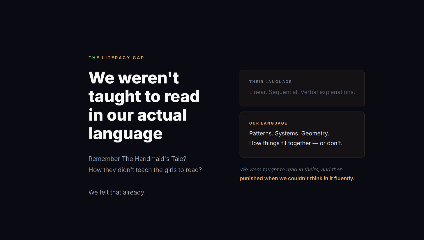 But we’ve been forced to operate in a world that only accepts linear, verbal explanations. Asked to translate spatial, multidimensional pattern recognition into sequential text. Then told we’re broken when the translation fails.