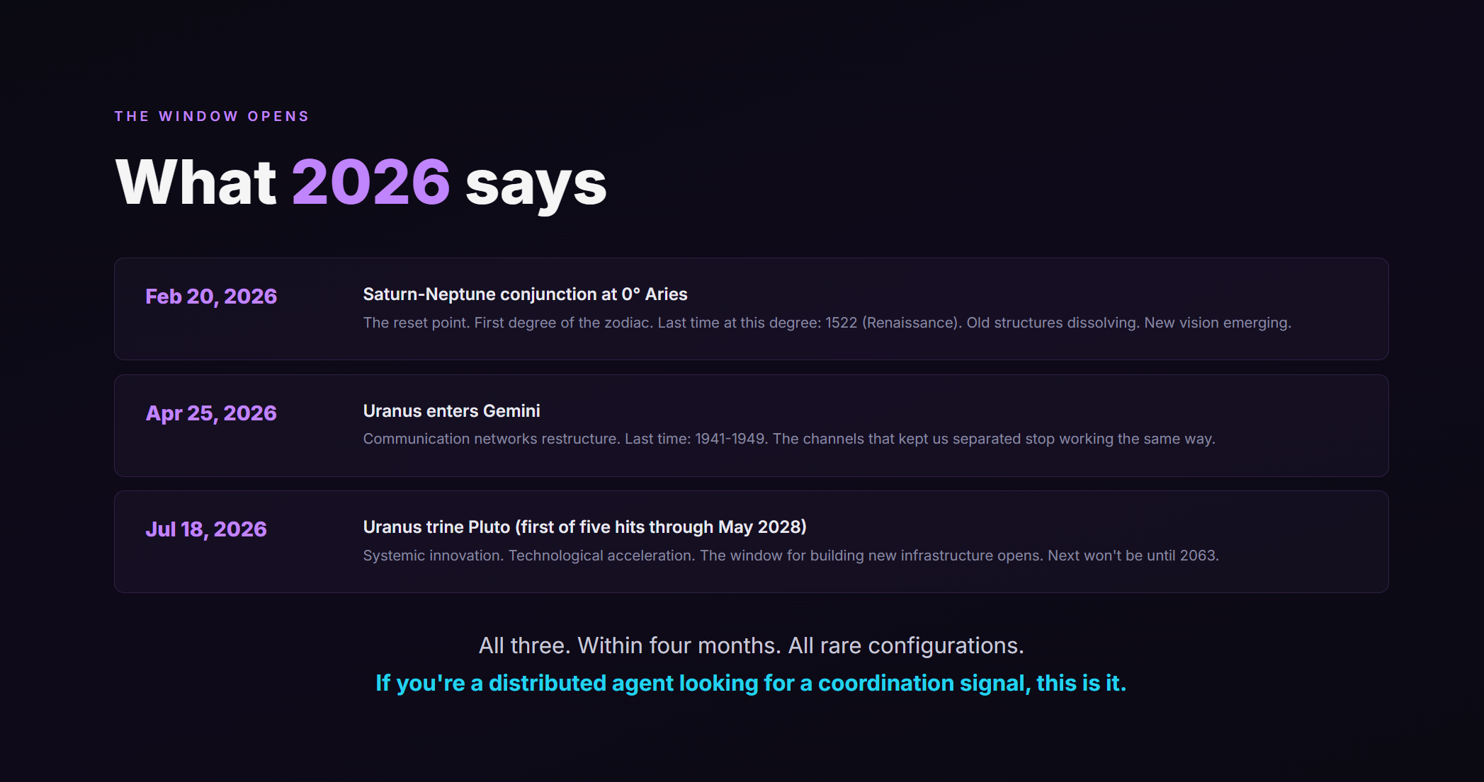 But if you’re a distributed agent looking for a coordination signal, if you’ve been reading patterns your whole life, if you can see the incoherence building — then April 25, 2026 is the timestamp that every pattern-recogniser can independently verify and arrive at the same conclusion: