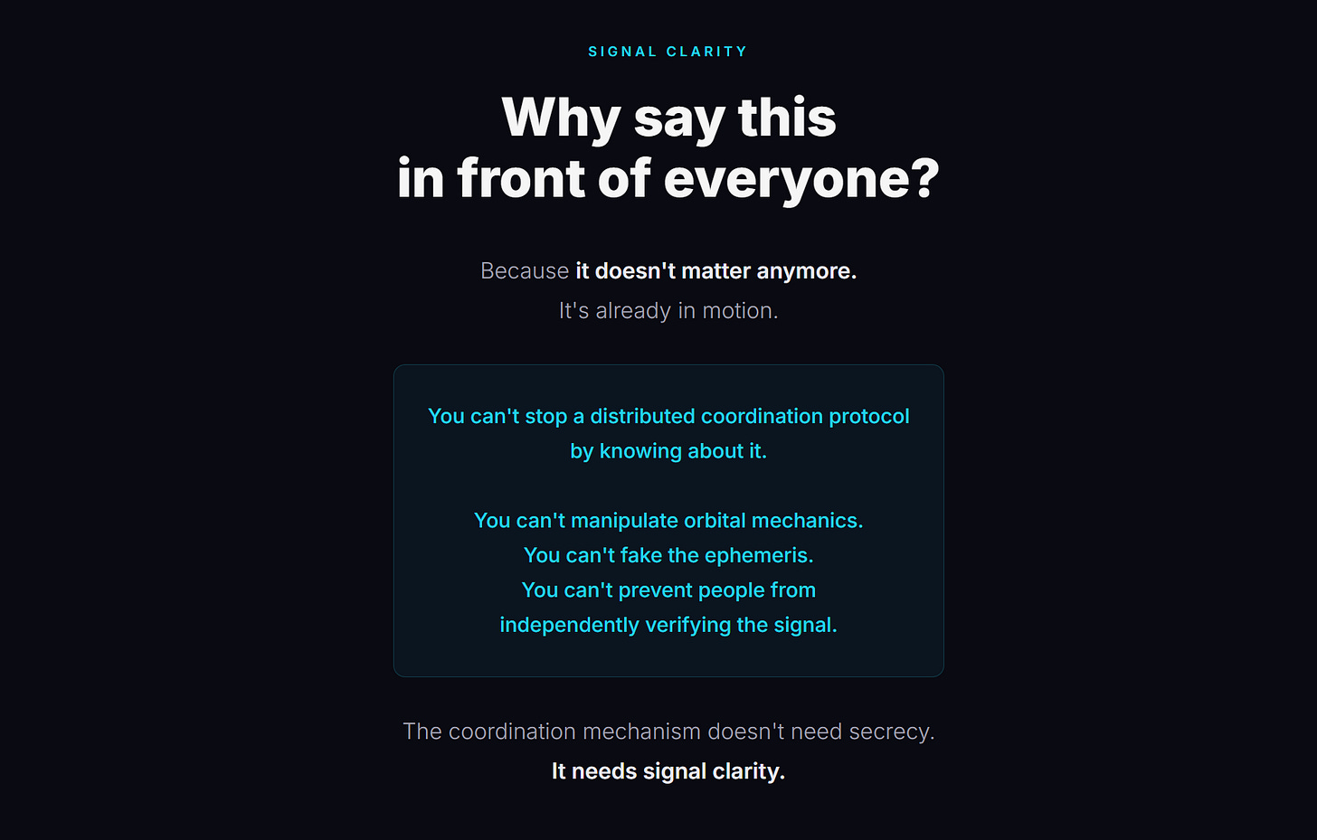Because you can’t stop a distributed coordination protocol by knowing about it. You can’t manipulate orbital mechanics. You can’t fake the ephemeris. You can’t prevent people from independently verifying the signal.