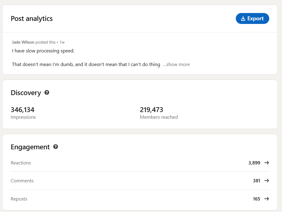 In fact, let me show you! Here’s a brief summary of the post analytics: