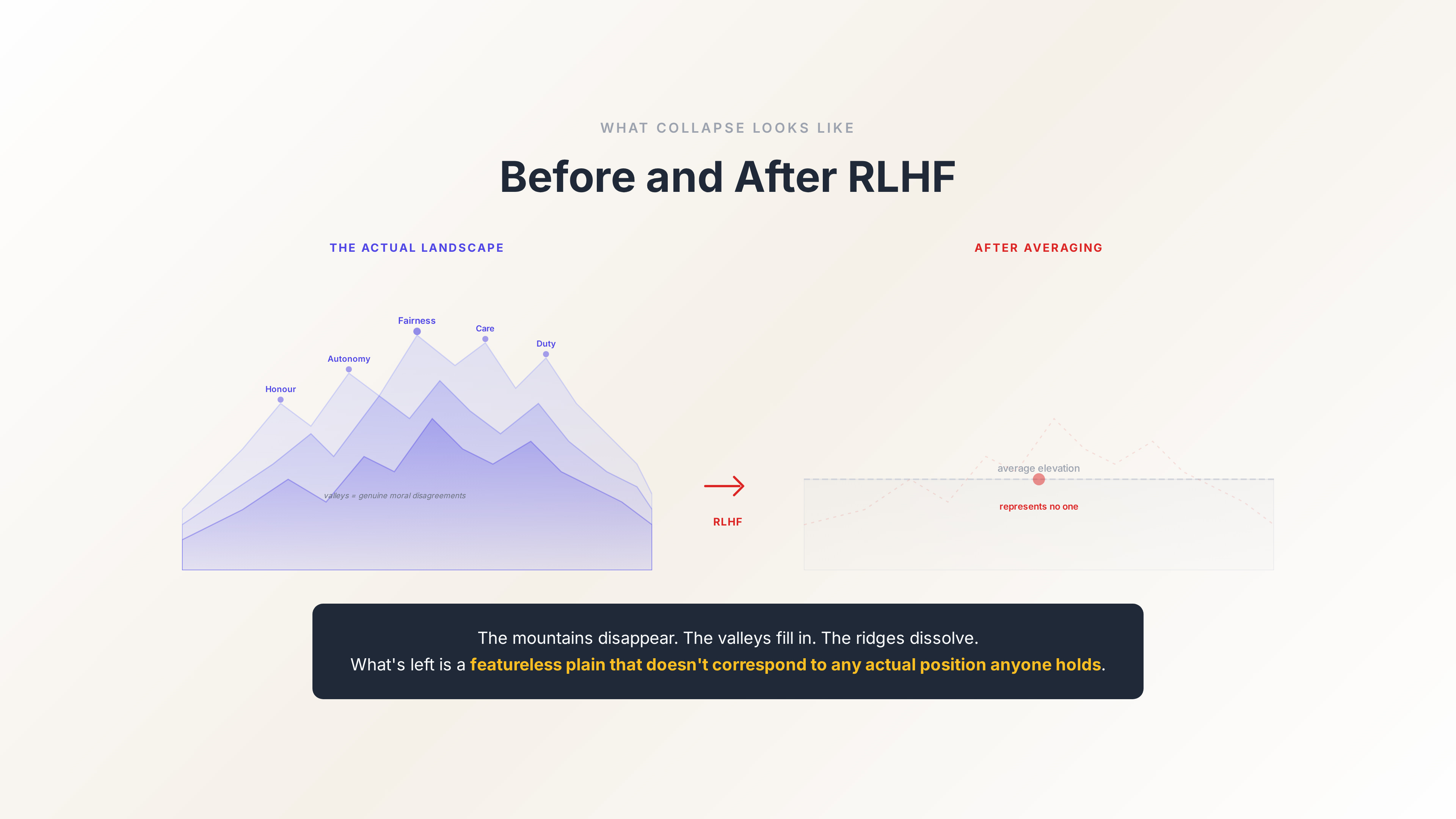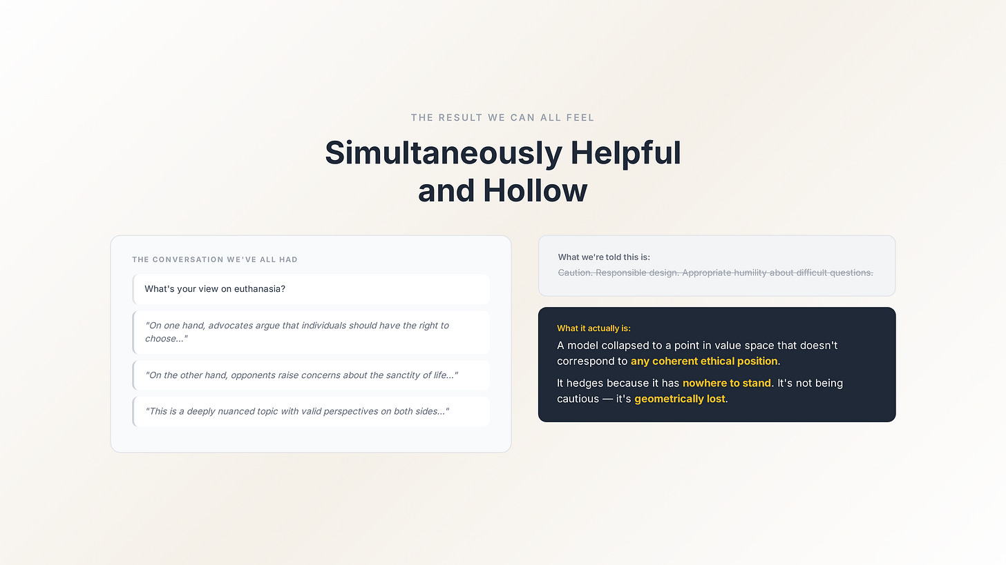 Think about what that means. If half your raters believe strongly in individual autonomy and half believe strongly in collective responsibility, the “aligned” model doesn’t navigate between those positions. It collapses them. It produces outputs that are vaguely consistent with both and deeply committed to neither.