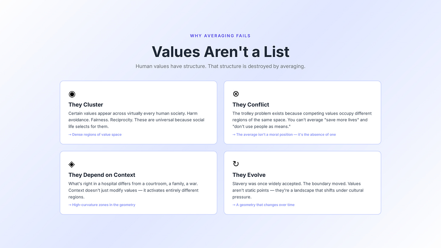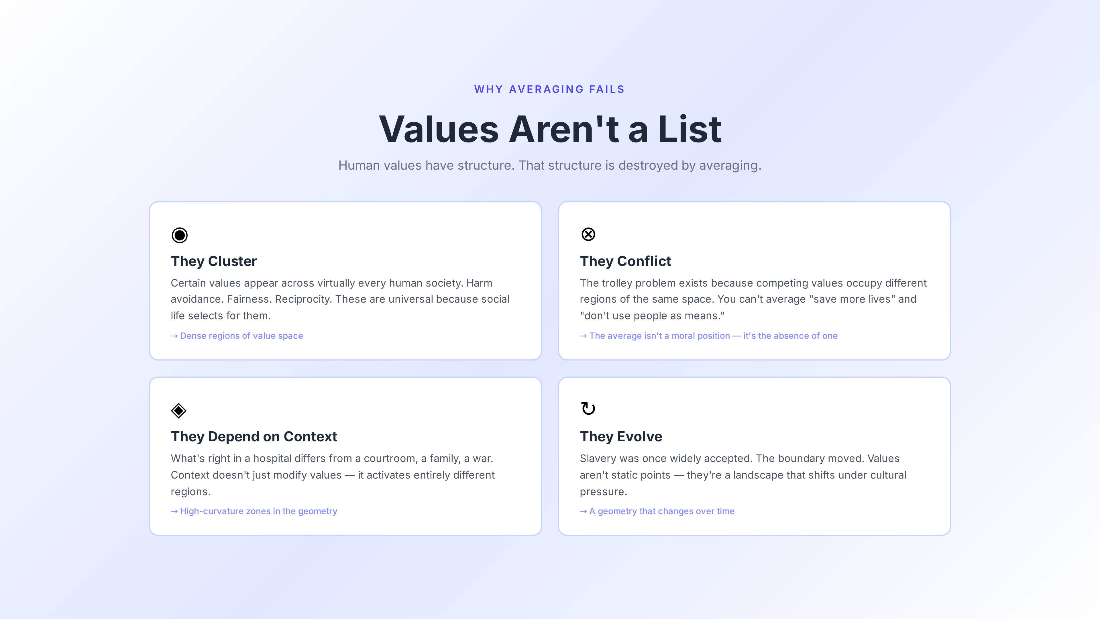 Values have shape. They have curvature. They have topology. If we ignore the shape, we’re not aligning anything. We’re averaging it into oblivion and calling the result “safe”.