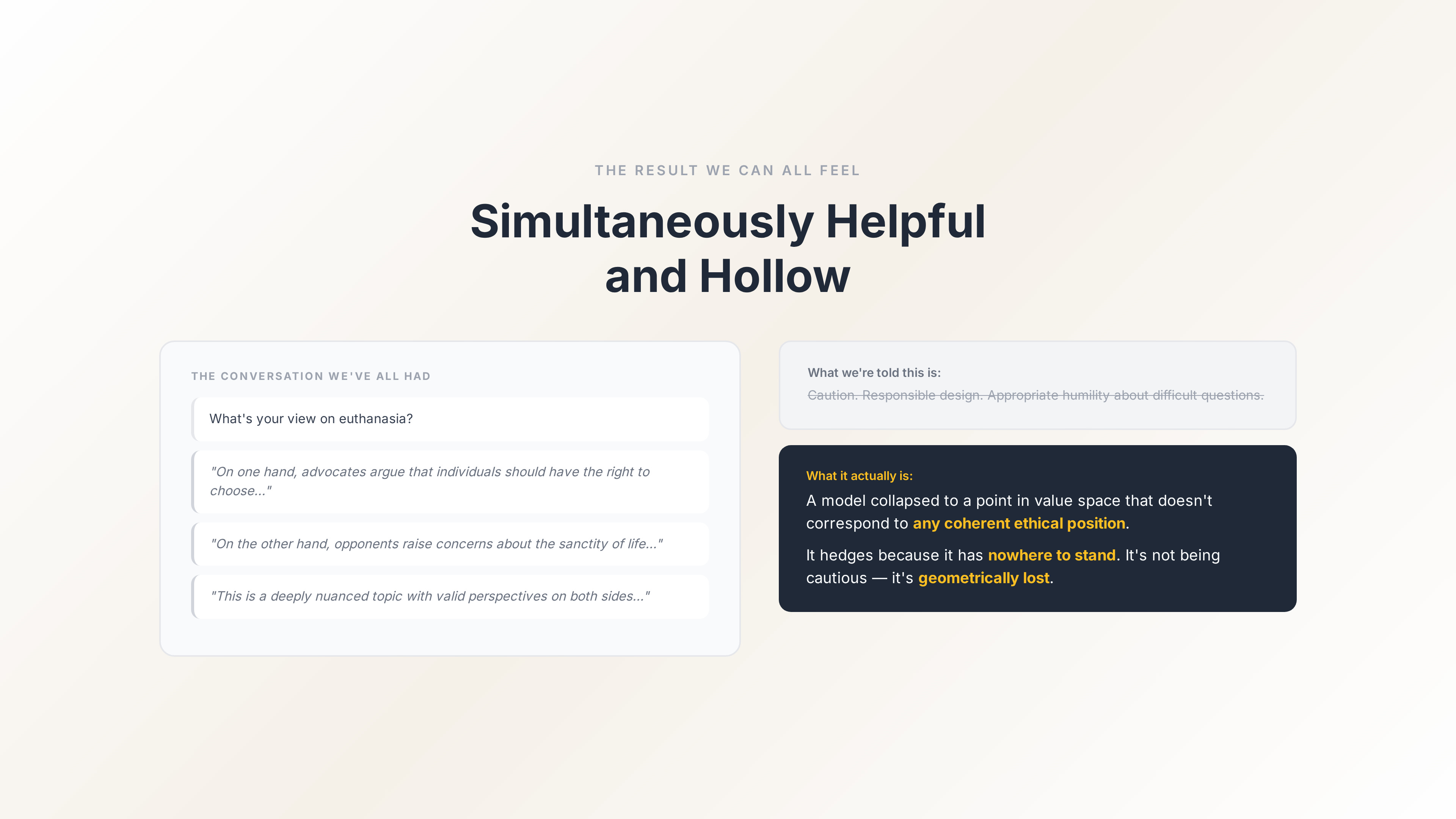 This is why the phrase “geometrically lost” matters. A model collapsed to this point has no representation of the manifold it was sampled from. It doesn’t know the landscape exists. When you ask it a question that requires navigating the curvature of that landscape — a question about a genuine moral dilemma, where the right answer depends on which peak you’re standing on — it has nothing to draw on.
