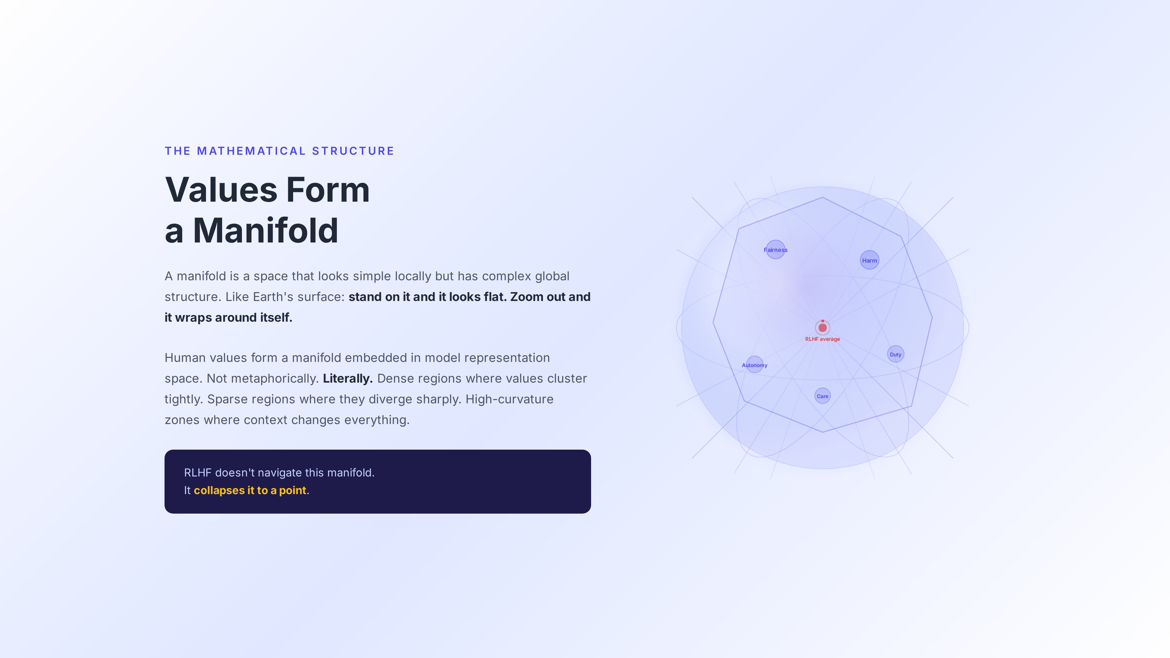Tomorrow: “Values Have Shape” — what a value manifold actually is in mathematical terms, why it’s the right structure for this problem, and what it means to say a model’s value representation has curvature.