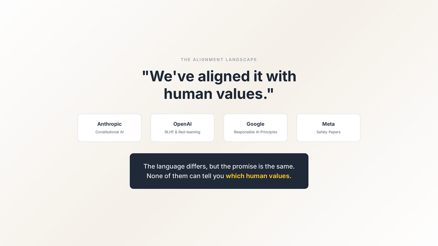 Every major AI lab claims their models are aligned. Anthropic talks about constitutional AI. OpenAI talks about RLHF and red-teaming. Google talks about responsible AI principles. Meta publishes safety papers.