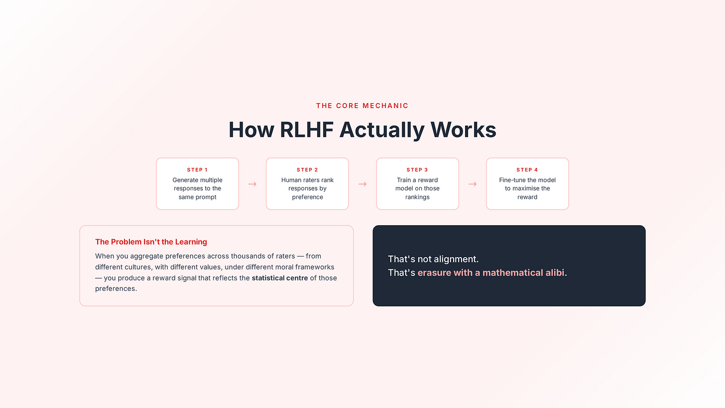 When you aggregate preferences across thousands of human raters — who come from different cultures, hold different values, operate under different moral frameworks — you produce a reward signal that reflects the statistical centre of those preferences. The model optimises toward that centre.