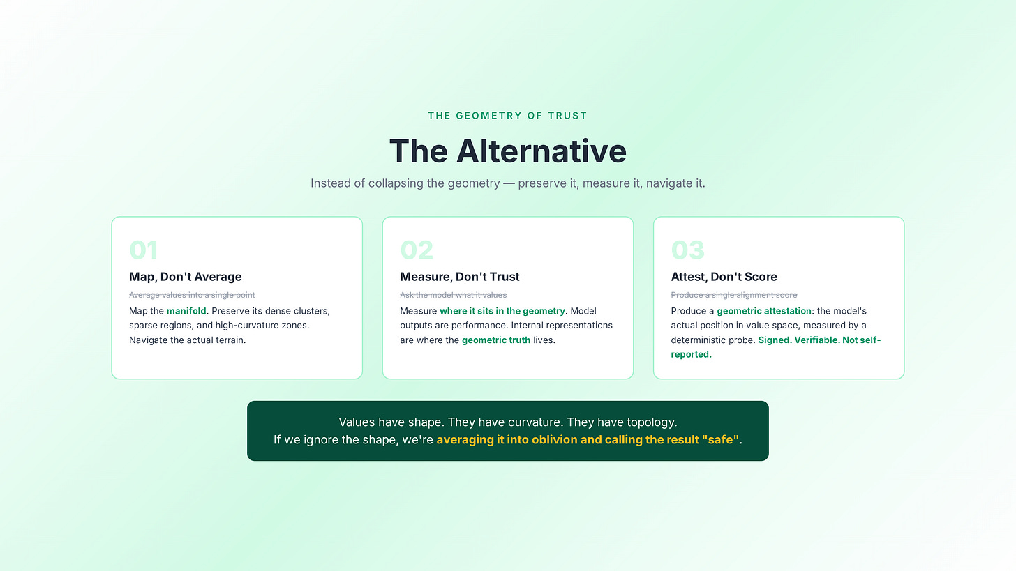 Instead of a single alignment score, produce a geometric attestation: a measurement of the model’s actual position in value space, produced by a deterministic probe that reads the model’s representations independently of its output layer. Signed. Verifiable. Not self-reported.