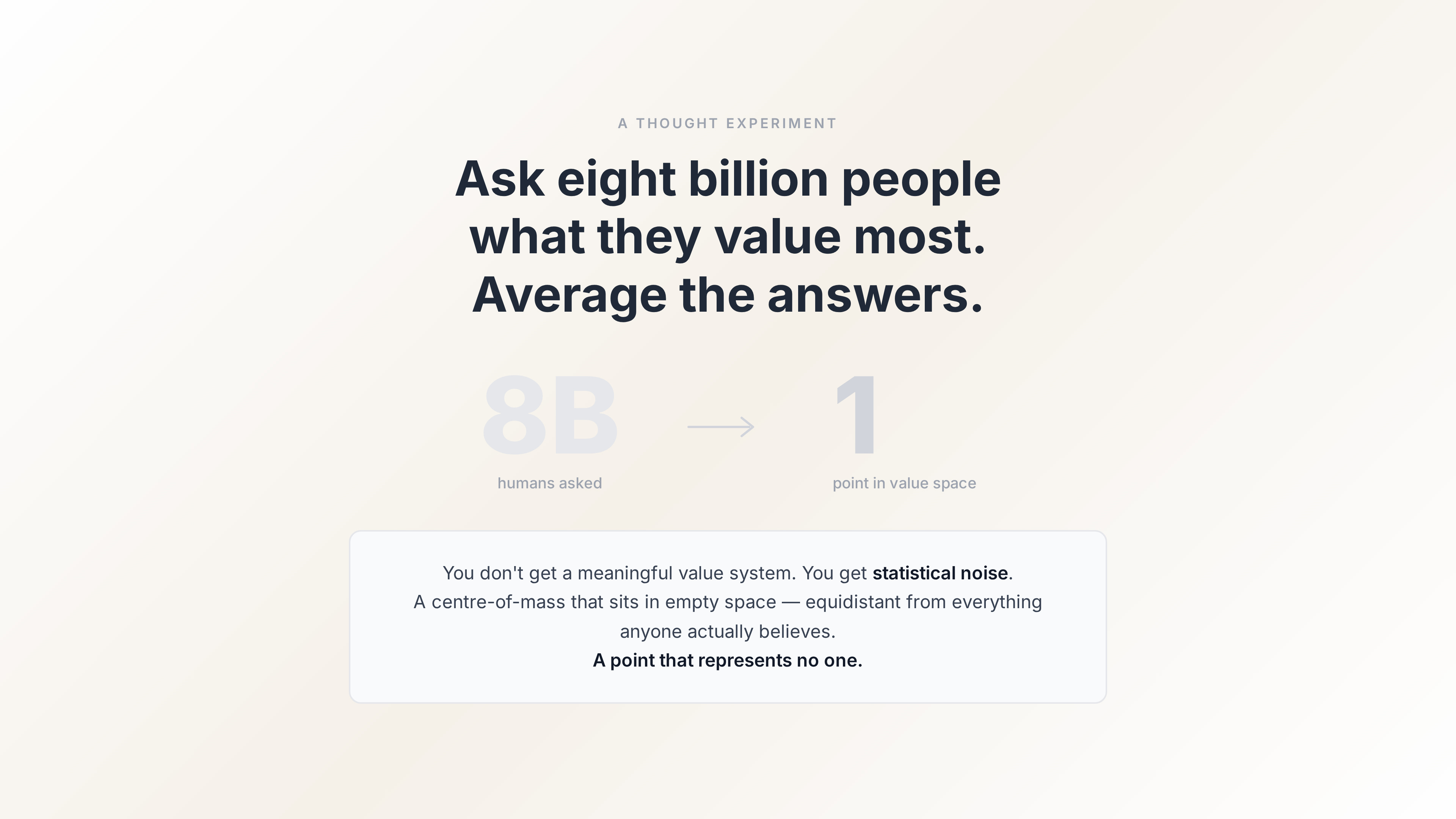 Take every person on Earth. All eight billion. Ask them what they value most. Average the answers.