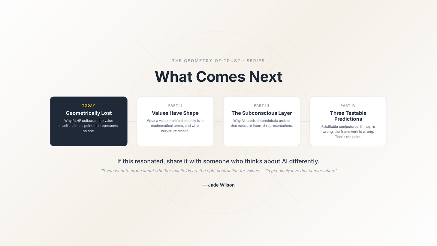 If this resonated, share it with someone who thinks about AI differently. The Geometry of Trust series continues tomorrow.