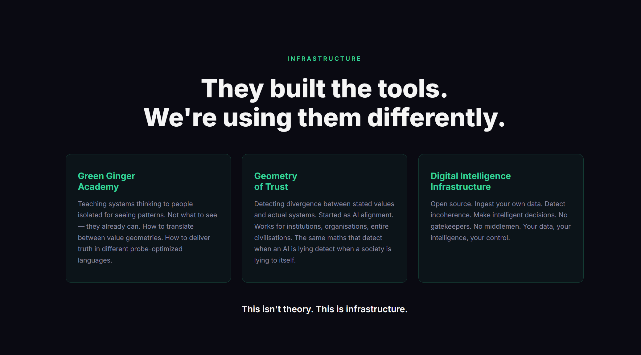 Geometry of Trust: A framework for detecting divergence between stated values and actual systems. Started as AI alignment. Realized it works for institutions, organizations, entire civilizations. It’s on GitHub. It’s real. It measures incoherence geometrically. The same mathematics that detect when an AI is lying detect when a society is lying to itself.