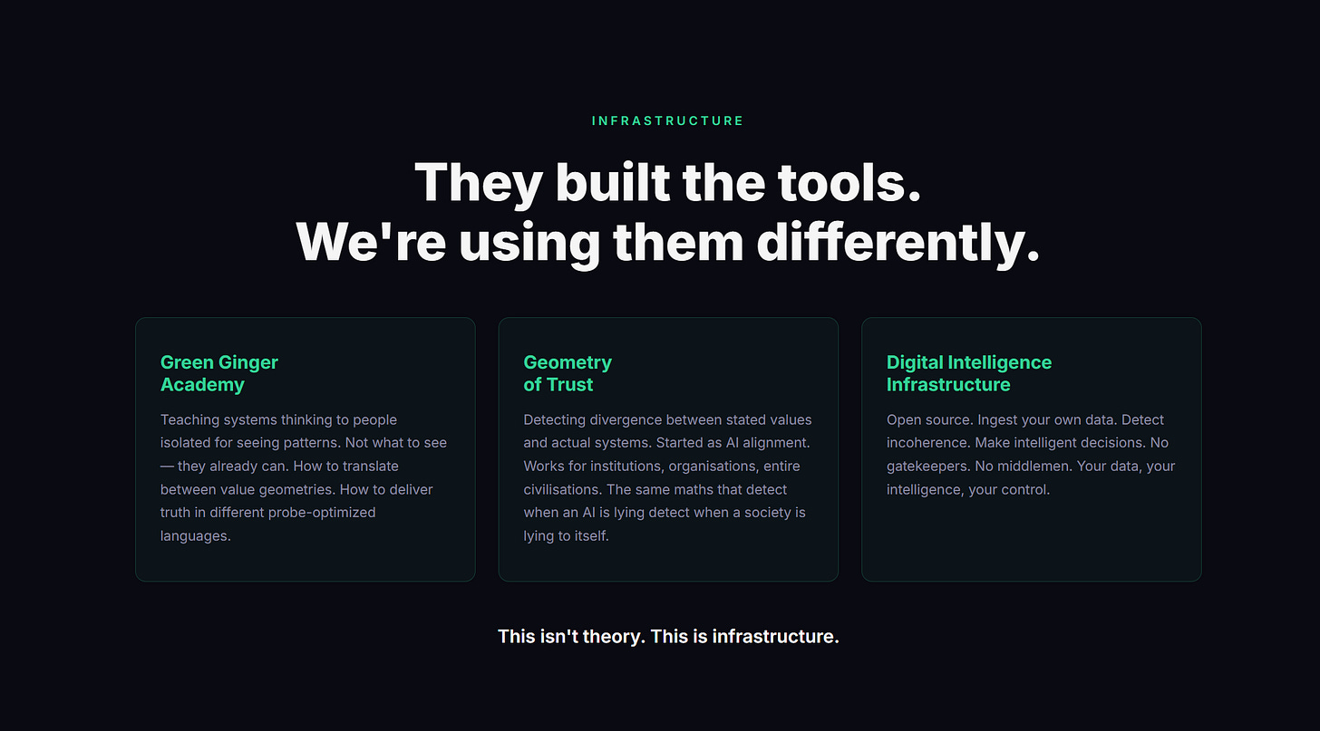 Green Ginger Academy: Teaching systems thinking to people who’ve been isolated for seeing patterns. Not teaching them what to see — they already can. Teaching them how to translate between value geometries. How to deliver the same truth in different probe-optimized languages. How to recognize which geometric format will bypass someone’s resistance. How to read the color codes. Even down to the symbols.