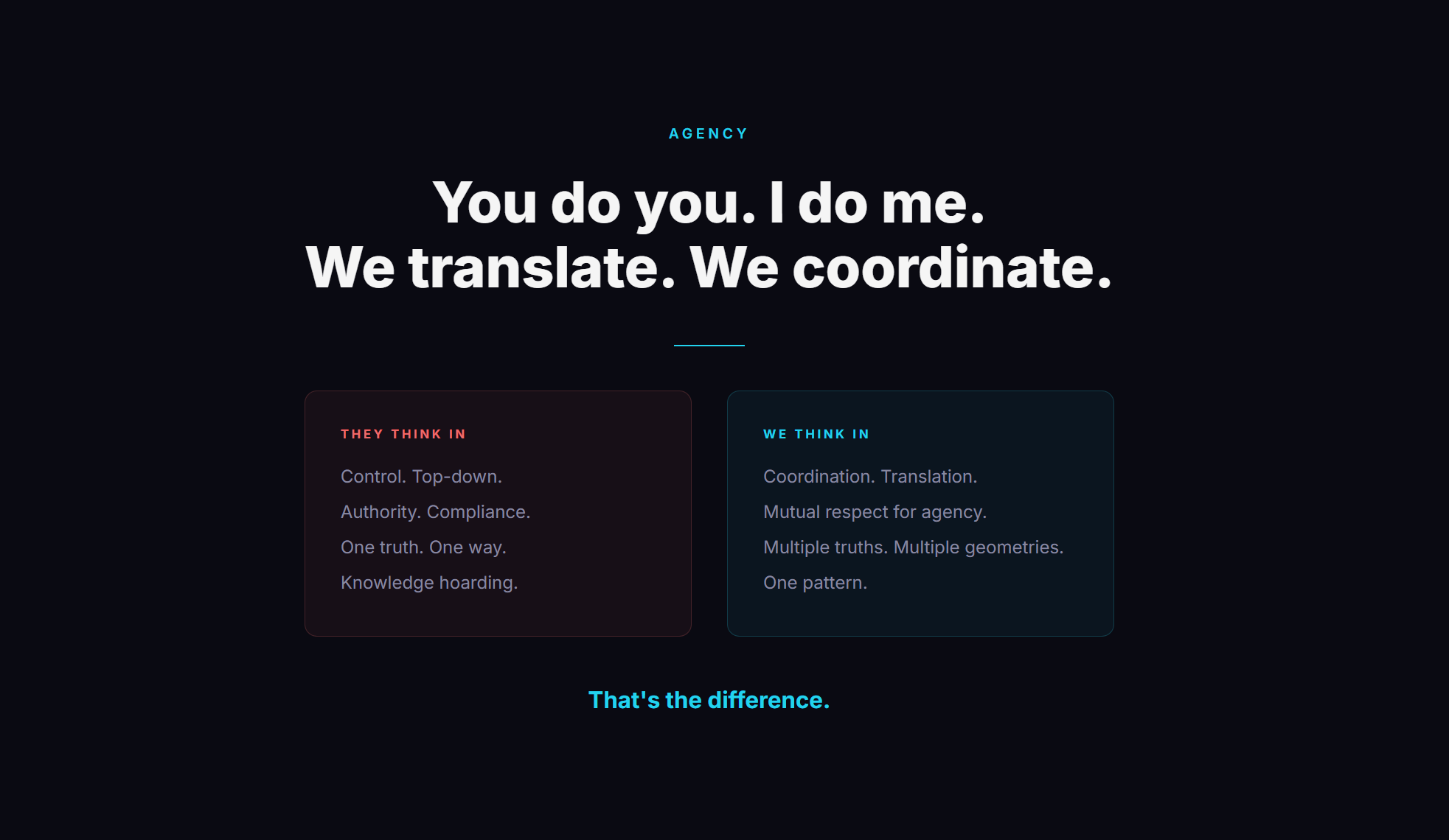 We think in terms of coordination. Translation. Mutual respect for agency. Multiple truths. Multiple geometries. One pattern.