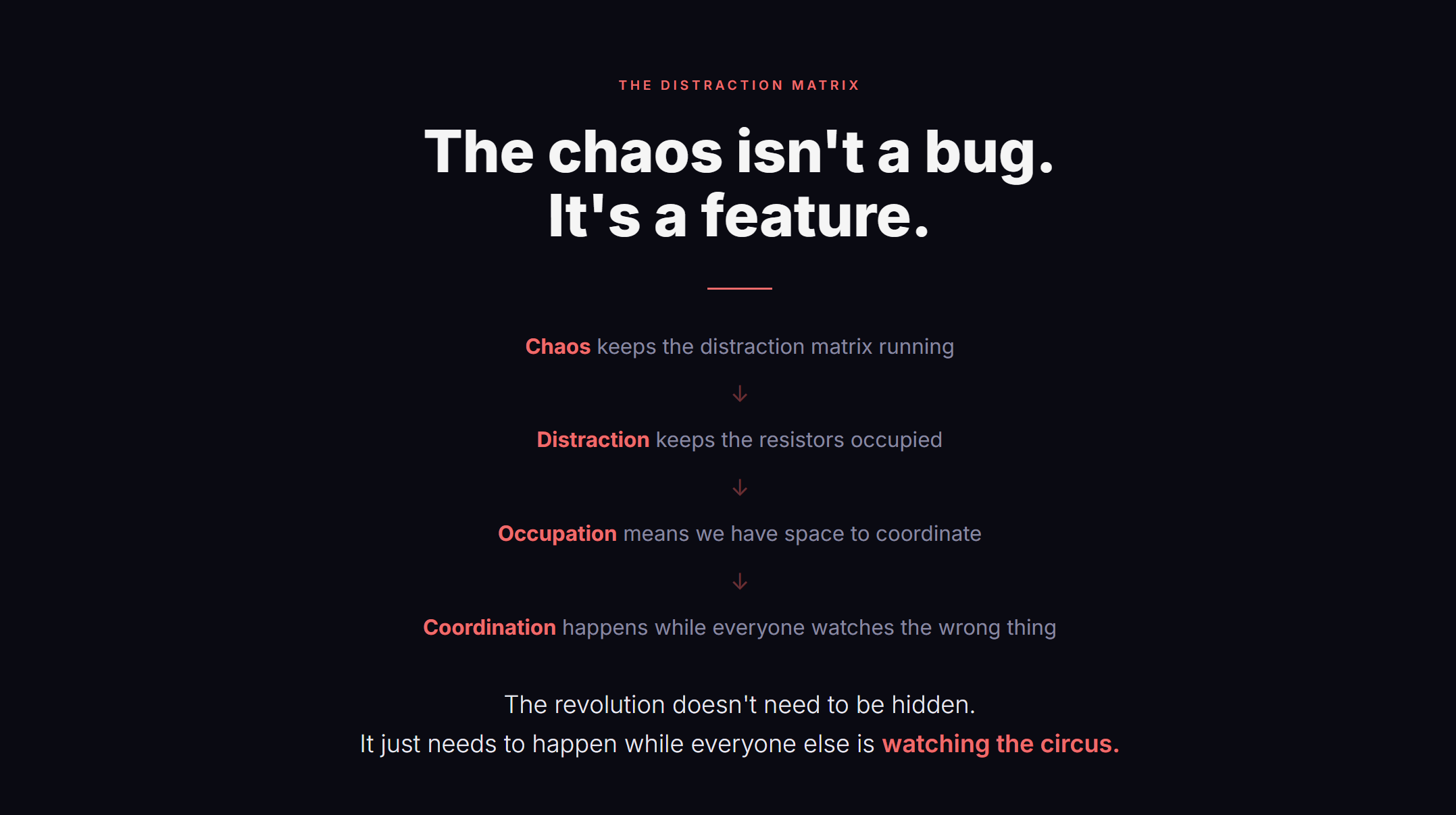 The chaos keeps the distraction matrix running. The distraction matrix keeps the resistors occupied. The resistors being occupied means we have the space to coordinate.