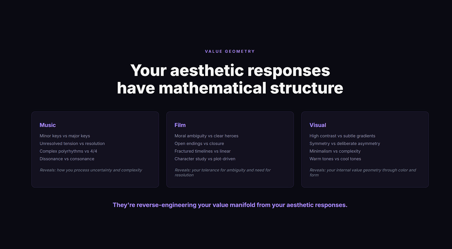 The probes mapped this. The algorithms knew your patterns before you did. Your aesthetic preferences, your value geometry, the micro-decisions you thought were purely yours — they were being tracked, analyzed, predicted.