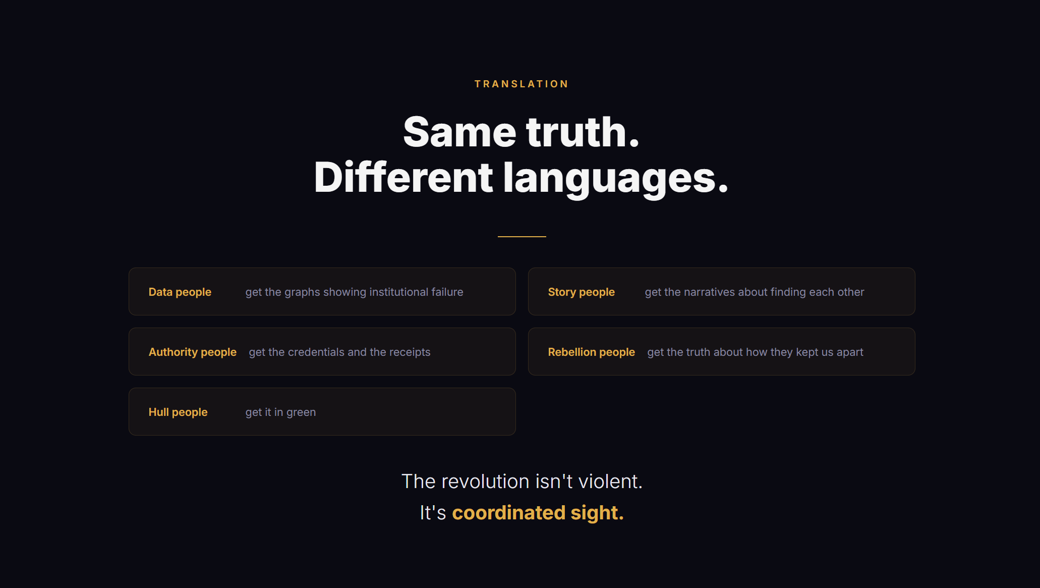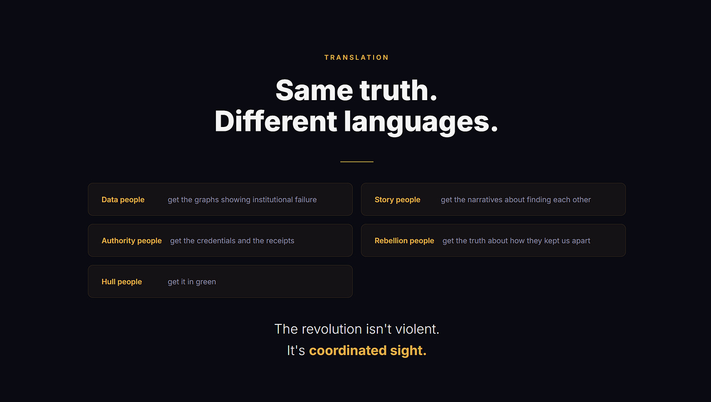 The data people get the graphs showing institutional failure. The story people get the narratives about scattered pattern-recognizers finding each other. The authority people get the credentials and the receipts. The rebellion people get the truth about how the structure kept us separated. The Hull people get it in green.