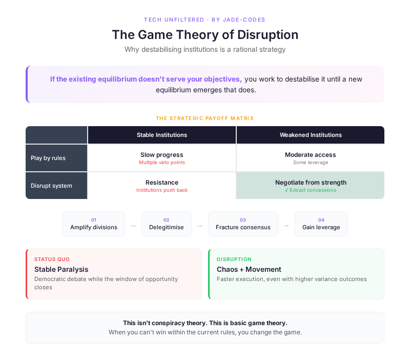 This isn’t conspiracy theory. This is basic game theory. If the existing equilibrium doesn’t serve your objectives, you work to destabilise it until a new equilibrium emerges that does.